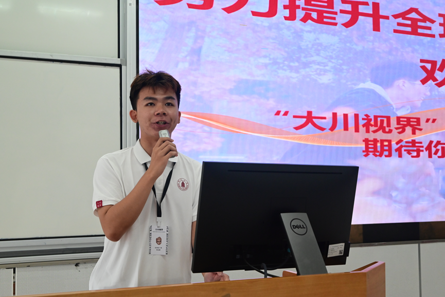 学工部“大川视界”项目宣讲团学长向新生介绍了学校丰富的国际交流资源。他通过生动案例分享了短期访学、海外名校暑期课程、国际联合培养等项目的参与体验,强调“大川视界”对拓展全球视野、提升跨文化沟通能力的重要作用。小导师鼓励新生提前规划语言学习,积极关注国际处和成人导航